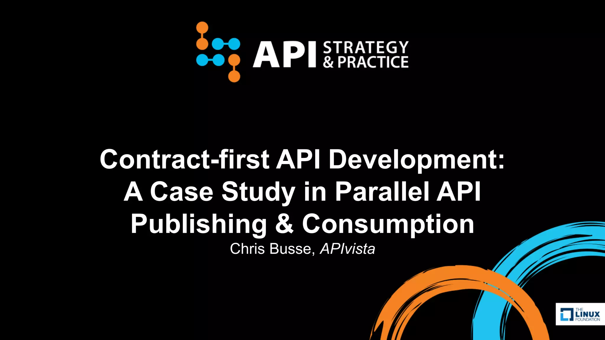 This document discusses a case study of contract-first API development used for a project with TidalScale, highlighting the importance of collaboration between design, front-end, and back-end teams. The process involved creating a structured OpenAPI specification which facilitated parallel development, rapid feedback, and effective communication among stakeholders. Key takeaways emphasize the significance of good communication, governance, and adapting to various API types beyond REST.