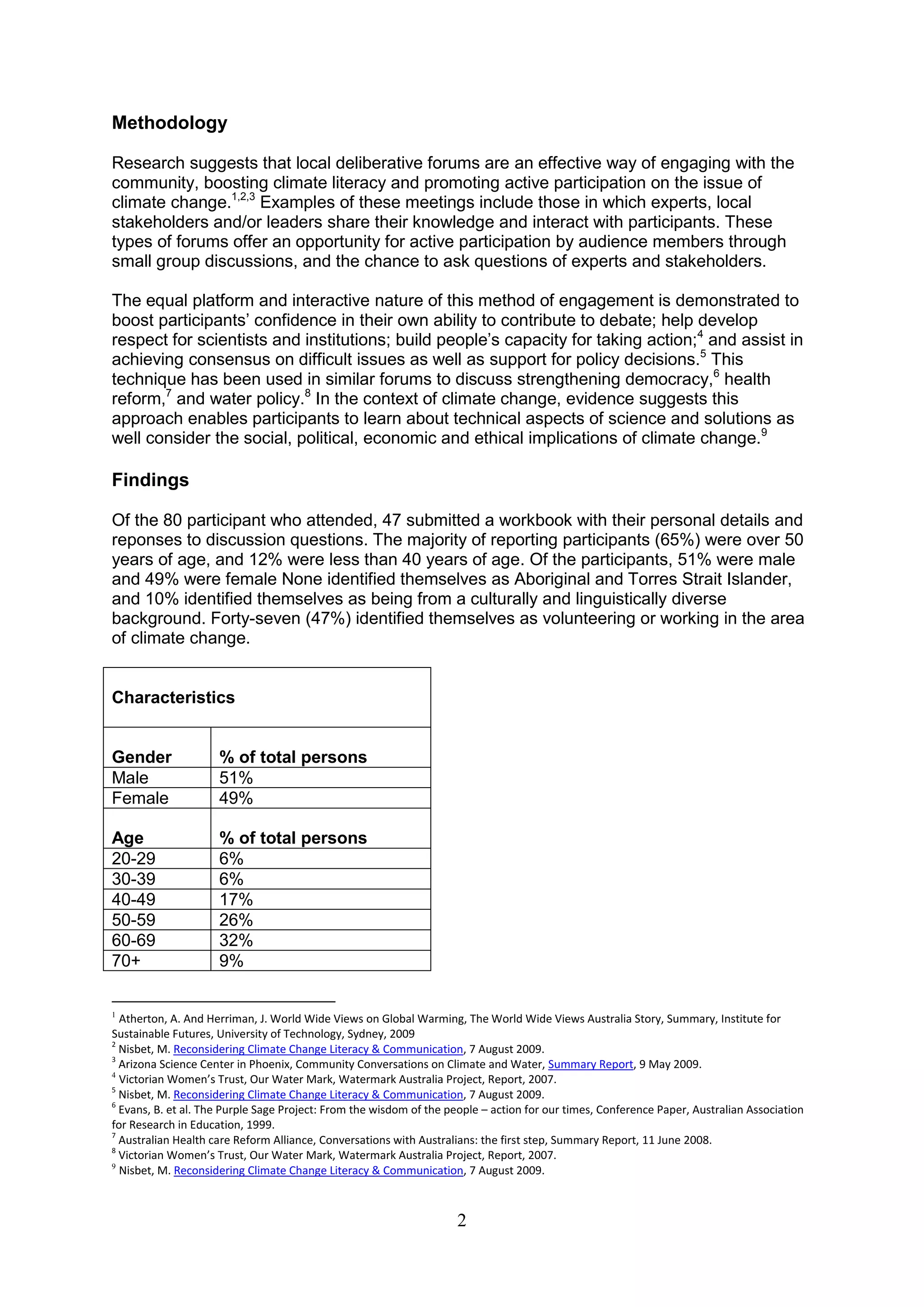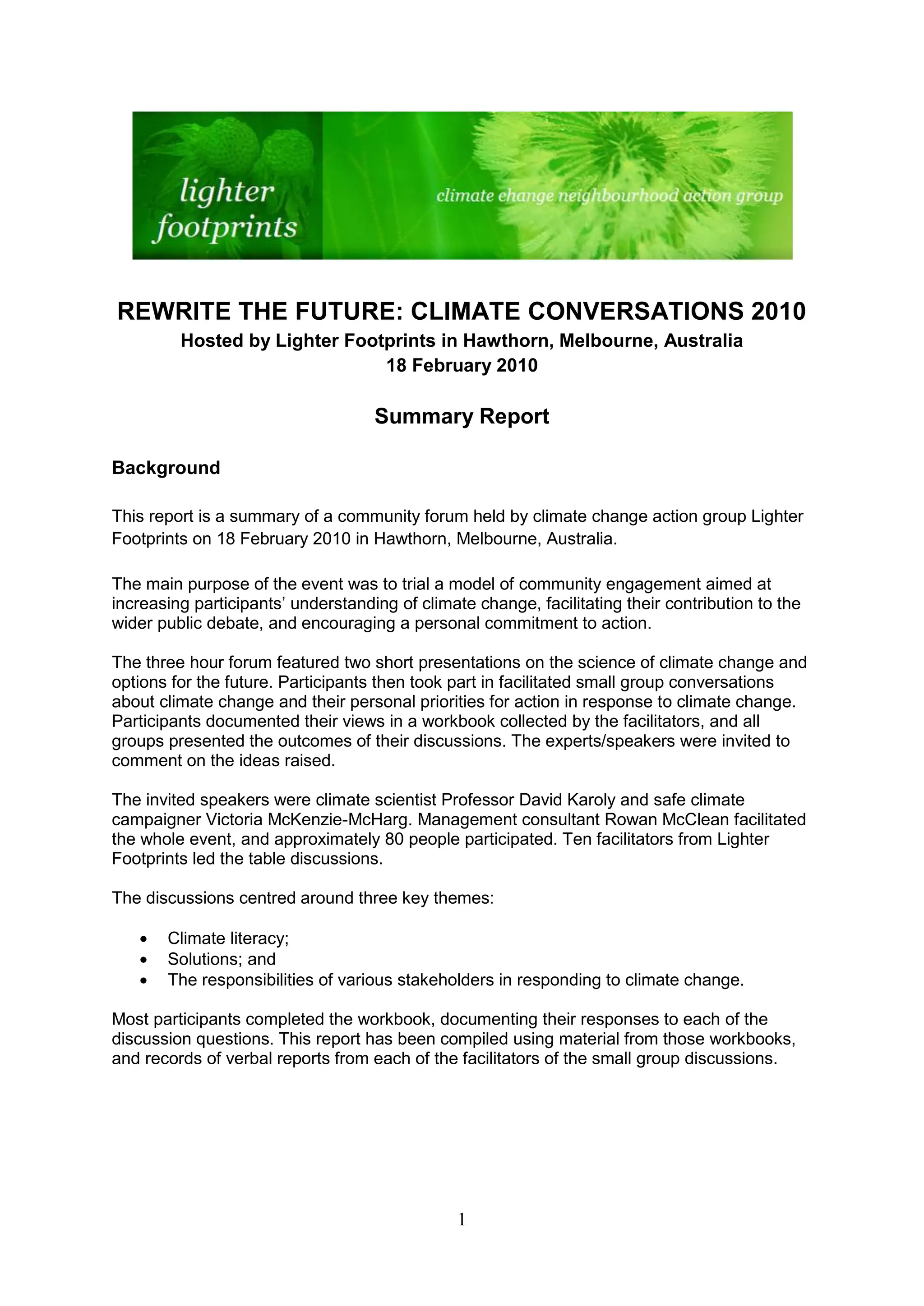 The document summarizes a community forum on climate change hosted by Lighter Footprints in Melbourne, Australia. 80 people participated in presentations and small group discussions on climate literacy, solutions, and stakeholder responsibilities. Participants felt that climate literacy in the community is generally poor and more education is needed, through schools, community forums, and improved media reporting. Improving understanding of the science of climate change and its implications was seen as vital to enabling informed debate and political action on climate solutions. Suggestions to increase literacy included more education programs, short courses, and using various media to convey that addressing climate change can maintain or improve quality of life.