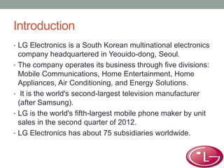 LG Electronics is a South Korean multinational electronics company with five divisions: Mobile Communications, Home Entertainment, Home Appliances, Air Conditioning, and Energy Solutions. It is the world's second largest TV manufacturer and fifth largest mobile phone maker. The document provides details on LG's operations, products, branding and sponsorships.