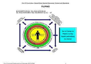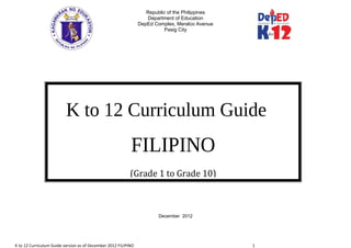 Ang dokumento ay isang gabay sa kurikulum ng Filipino para sa K to 12, na naglalayong linangin ang kakayahang komunikatibo, mapanuring pag-iisip, at pagpapahalagang pampanitikan ng mga mag-aaral mula Kindergarten hanggang ika-12 baitang. Nakatuon ito sa paggamit ng mga lokal at teknolohiyang kagamitan sa pagtuturo, kasabay ng pag-unawa sa mga kultural na konteksto at pangangailangang panlipunan. Ang gabay ay naglalaman din ng mga pamantayan at kasanayan na inaasahang maipamalas ng mga mag-aaral sa bawat baitang.