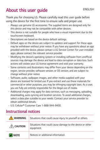 This document is the user guide and limited warranty for an LG mobile device model LG-US375. It provides instructions on safely using the device and its accessories and notes that default apps are subject to changes. The limited warranty covers defects in materials and workmanship for 12 months and excludes issues from misuse, improper use, or unauthorized modifications. It also contains procedures for resolving disputes through binding arbitration instead of legal action.