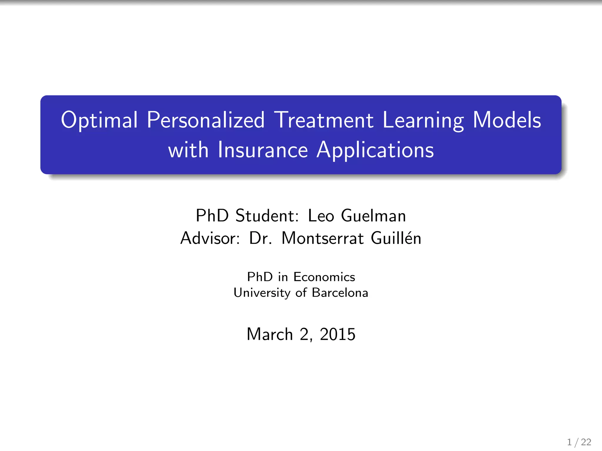 The document outlines Leo Guelman's PhD thesis on developing improved statistical and algorithmic methods for personalized treatment learning (PTL) models, with applications to insurance. It introduces PTL, which aims to select the optimal treatment for each individual based on their characteristics. The thesis contributes novel PTL methods like uplift random forests and causal conditional inference trees, and shows they outperform existing approaches in simulations. It also applies PTL to optimize insurance marketing strategies using experimental data from a large insurer.