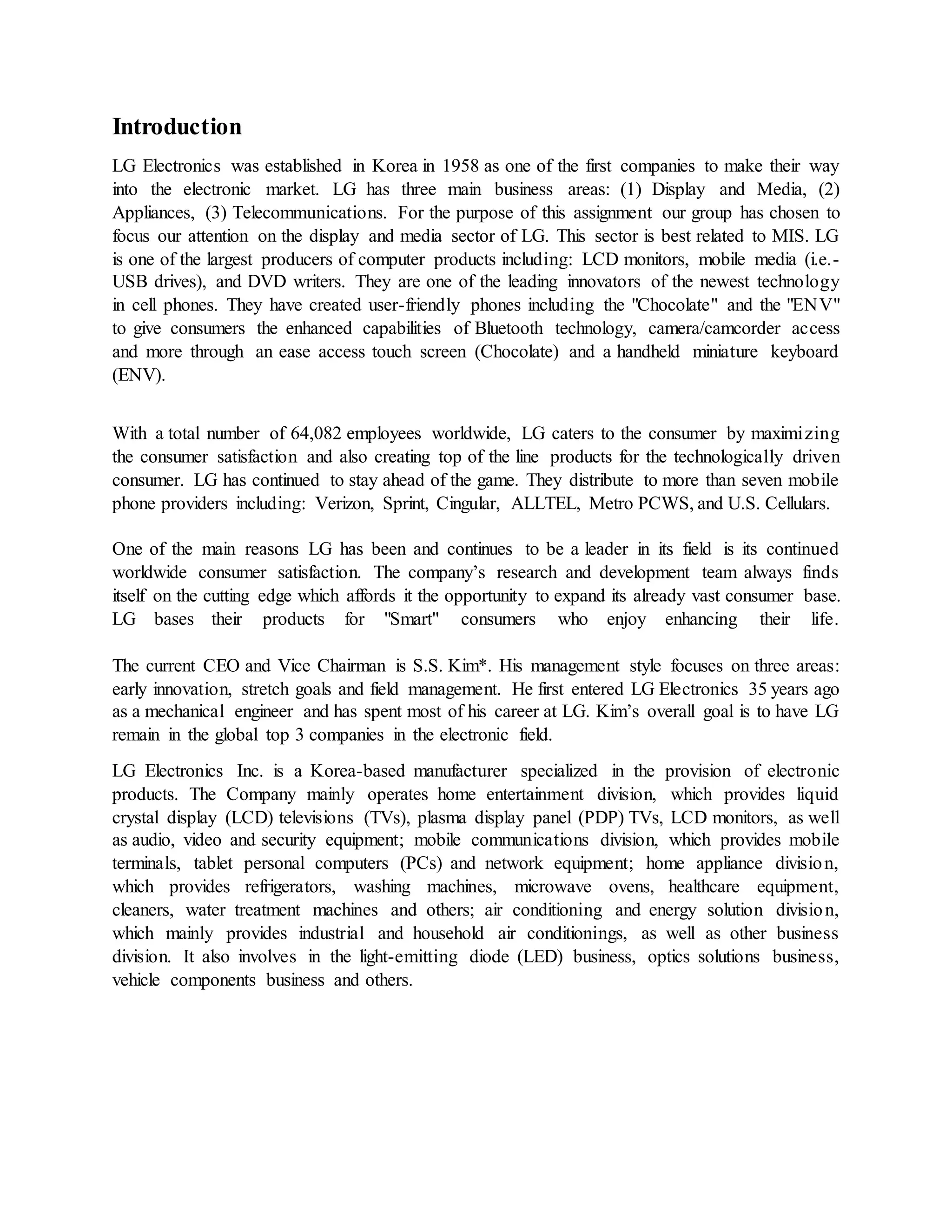 LG Electronics was established in 1958 in Korea and has grown to be a leading global electronics company. It has four main business units: home entertainment, mobile communications, home appliances, and vehicle components. LG produces a wide range of consumer electronics including TVs, monitors, home appliances, smartphones, and more. It has 128 operations worldwide and is constantly innovating and developing new technologies to stay ahead of competitors in the electronics industry.