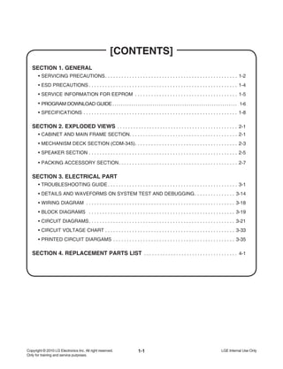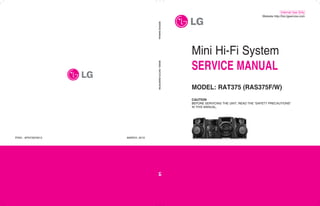 The document is a service manual for an LG Mini Hi-Fi System model RAT375. It contains sections on safety precautions for servicing the unit, ESD precautions, specifications for the unit, exploded views of parts, and electrical diagrams. The manual provides guidance on servicing the unit safely and properly as well as replacing parts. It aims to prevent damage from electrostatic discharge or other hazards during repair.