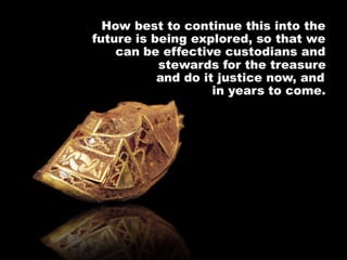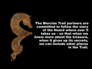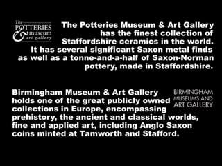 The Hammerwich Hoard, the largest Anglo-Saxon treasure ever found, was discovered in Staffordshire, UK in 2009. It contained over 1,500 pieces of gold and silver jewelry and fragments of weaponry from the 7th century Kingdom of Mercia. Worth £3.3 million, fundraising efforts led by the Art Fund and involving public donations helped acquire the hoard for Birmingham Museum and Art Gallery and the Potteries Museum in Stoke to develop the story of the hoard through the Mercian Trail exhibition. Further study is needed to understand the significance of the hoard and what it can reveal about Mercia and Anglo-Saxon society.