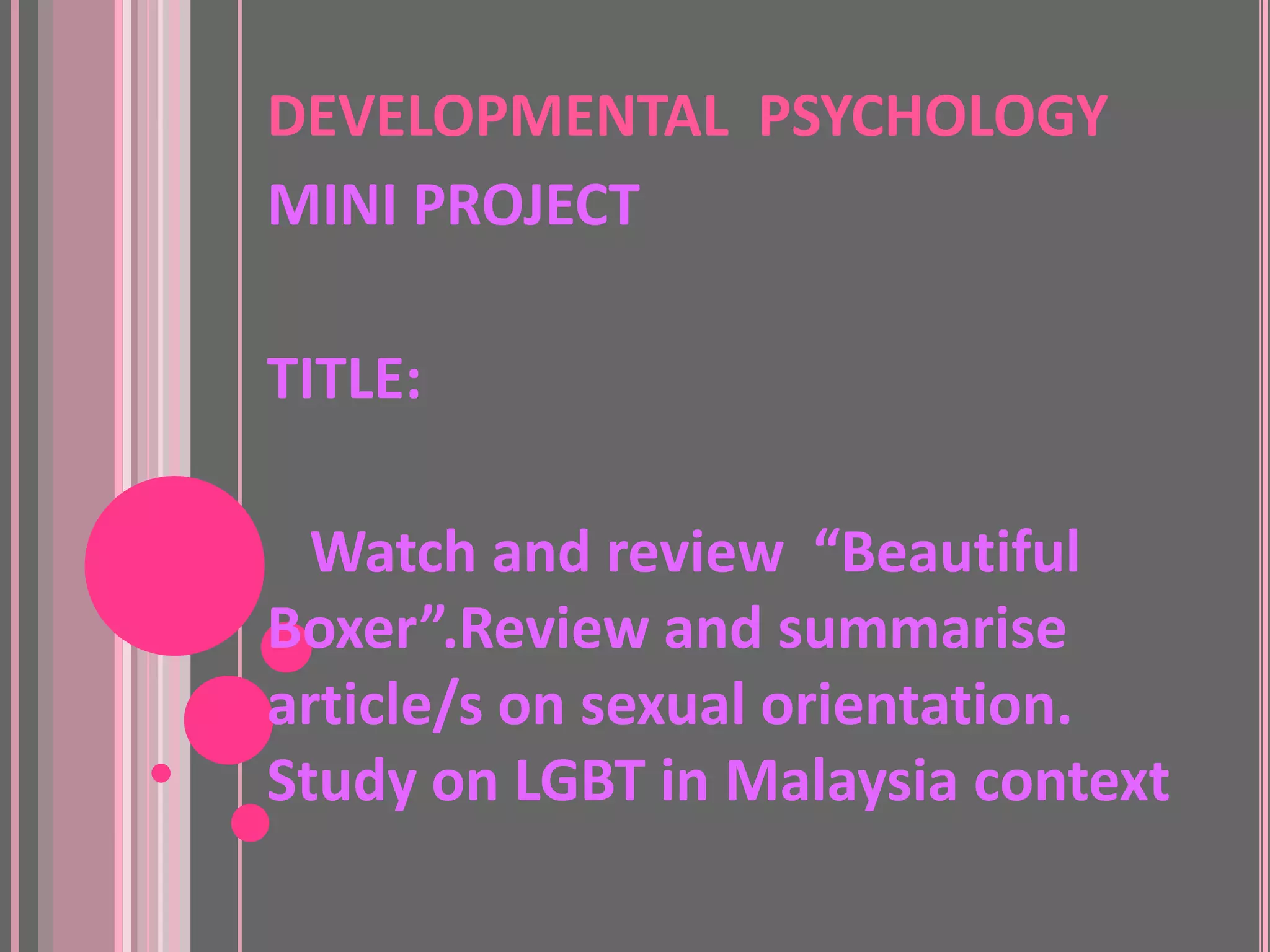 This document provides information about a developmental psychology mini project conducted by a group of students. It includes a synopsis of the film "Beautiful Boxer" which tells the true story of a Thai kickboxer who was born male but identified as female. The group watched the film and reviewed articles about sexual orientation. They studied topics like defining sexual orientation, discrimination based on sexual orientation, and examples of LGBT cases in the Malaysian context. The document also discusses symptoms of being gay, lesbian, or bisexual according to the Malaysian education ministry and provides definitions and context for bisexual and transgender individuals in Malaysia.