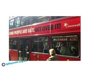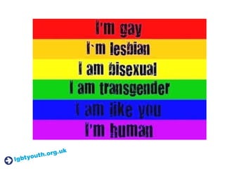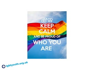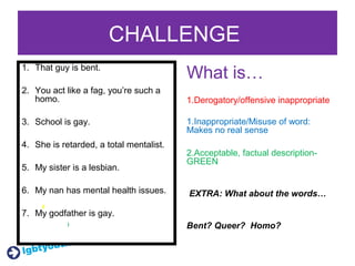 This document discusses LGBT terminology and provides context around commonly used and misunderstood words. It explains that language evolves over time and certain words that were previously acceptable are now considered derogatory or inappropriate. It notes some words like "bent", "queer", and "homo" can be offensive. The document also discusses how using discriminatory language, whether verbally or online, could result in legal consequences if deemed racist, homophobic, or offensive towards those with disabilities. It encourages thinking about related news stories and concludes with basic information about LGBT people and history, as well as a pledge of respect and safety for all.