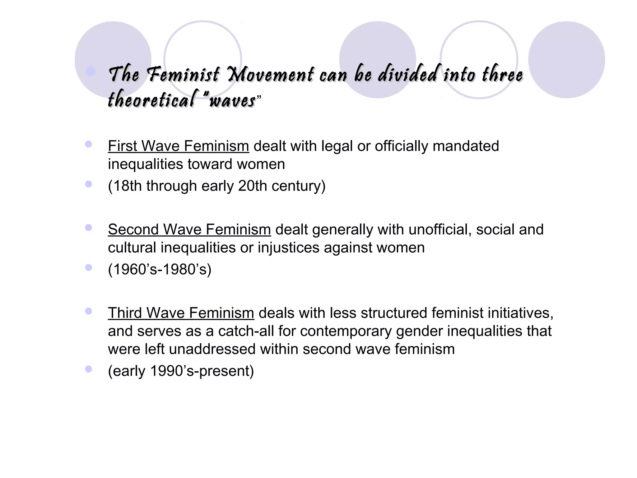 The document discusses the history and progression of the feminist movement and LGBT rights movements. It describes the three waves of feminism, from the first wave in the late 19th century dealing with legal inequalities, to the second wave in the 1960s-1980s addressing social and cultural issues, to the current third wave beginning in the 1990s encompassing a variety of gender issues. Key events and figures in both movements are outlined, such as the Stonewall riots, which sparked the modern gay rights movement in 1969, and the Matthew Shepard Act protecting LGBT individuals in 1998.