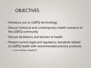 This document discusses LGBTQ health topics including definitions, prevalence, health concerns, and recommendations. It defines terms like transgender, non-binary, and intersex. It states that about 9 million people in the US identify as LGBTQ. It outlines higher rates of mental health issues, substance abuse, and suicide among LGBTQ youth and discusses recommendations to support LGBTQ health and safety in schools.