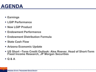 The document provides an agenda for an LGIP quarterly meeting and conference call. It includes discussions on LGIP and endowment performance, new LGIP products, endowment distribution formulas, state cash flow, and an Arizona economic update. A special presentation will be given by Alex Roever of JP Morgan Securities on the US short-term credit outlook. Time will also be provided for questions.