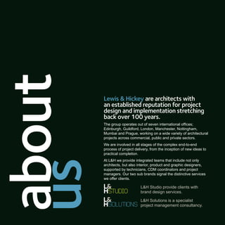 Lewis & Hickey is an architecture firm with over 100 years of experience in project design and implementation. They operate out of seven international offices and work across various sectors, including student living. The document discusses their holistic approach to design, understanding client needs, optimizing performance, knowledge of the student housing market, and trusted project delivery.