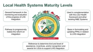 Local health systems maturity levels provide a framework for monitoring and evaluating progress on integrating local health systems. They serve as a basis for planning assistance and incentives to support integration. The levels determine the kind and level of support given to local government units based on their level of integration. They also provide a pathway for progressively realizing health system reforms through integration.