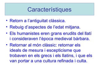 Característiques Retorn al’antiguitat clàssica. Rebuig d’aspectes de l’edat mitjana. Els humanistes eren grans erudits del llatí i consideraven l’època medieval bàrbara. Retornar al món clàssic: retornar els ideals de mesura i escepticisme que trobaven en els grecs i els llatins, i que els van portar a una cultura refinada i culta.