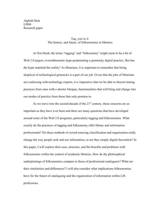 This document summarizes the history and use of folksonomies in libraries. It discusses how folksonomies arose from early social bookmarking sites and tagging practices on sites like Delicious. It defines folksonomies as classifications created by users through tagging resources with freely chosen keywords. The document compares folksonomies to professional cataloging schemes and discusses how folksonomies take a bottom-up approach without hierarchies or authority controls. It provides examples of how academic libraries have incorporated folksonomies and tagging through projects and tools to enhance discovery and organization of resources. However, adoption of these practices has been lower than expected, possibly due to users' uncertainty about how their contributions will be viewed.