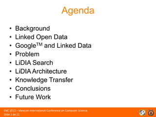 M.S.C. Cristian A. Rodríguez Enríquez presents LiDIA, an integration architecture that allows querying of multiple linked open data sets. LiDIA aims to address challenges in utilizing the growing amount of linked open data from different sources, which use different vocabularies and URIs. The presentation outlines the background of linked open data, Google's use of it, the problem LiDIA addresses, its search and architecture, an example of knowledge transfer, conclusions about the benefits of linked open data and sharing knowledge, and future work on natural language processing and cross-domain queries with LiDIA.