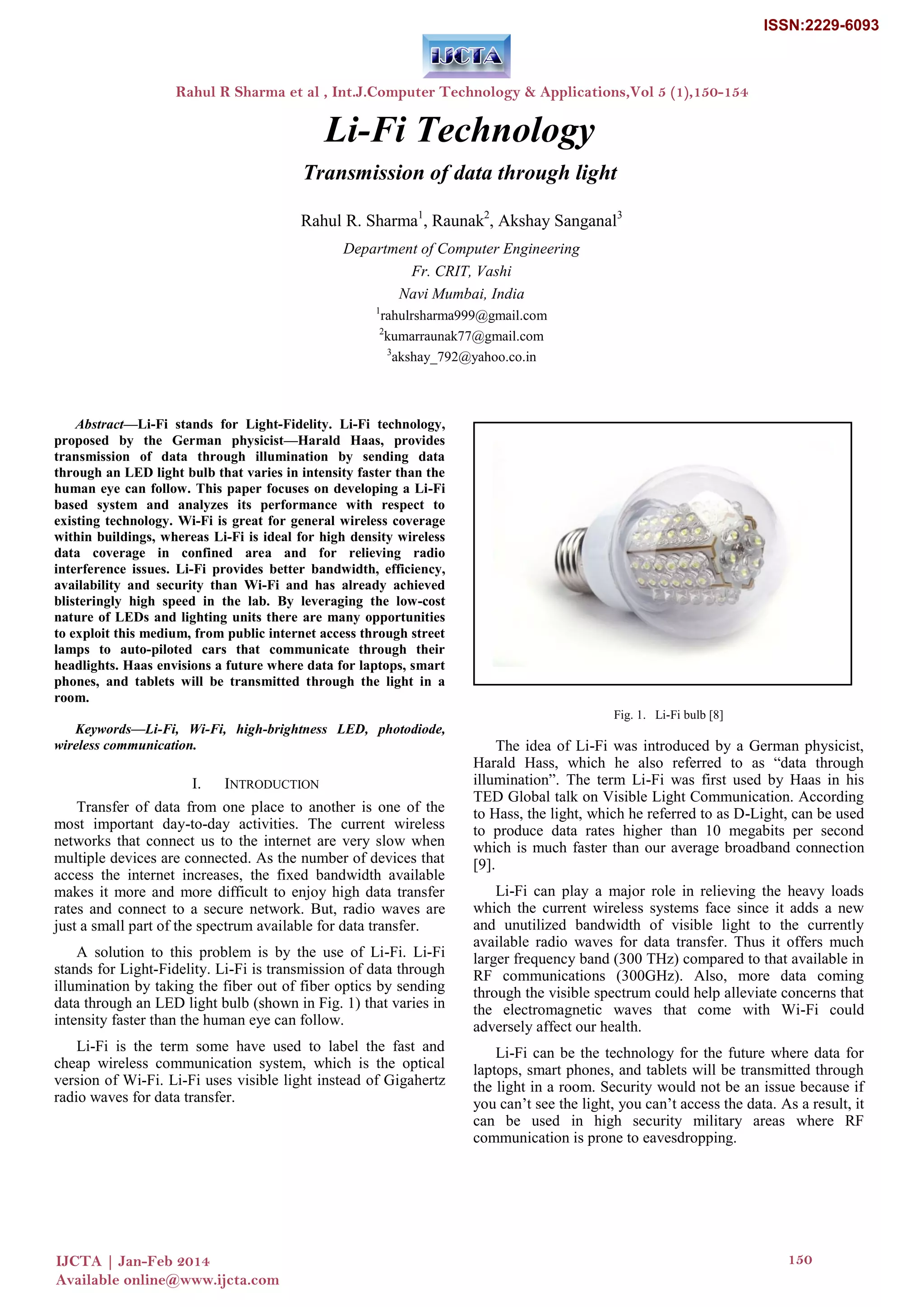 This document discusses Li-Fi technology, which transmits data through visible light communication. It describes how Li-Fi works by modulating the intensity of LED lights faster than the human eye can detect. This allows for transmission of digital data through light. The key components of a Li-Fi system are LED lights and photodiodes. Li-Fi provides several advantages over Wi-Fi such as higher speeds, more available bandwidth, more security as light cannot penetrate walls, and higher energy efficiency. Potential applications of Li-Fi include use in places where Wi-Fi signals cannot reach or are banned, like on airplanes or in hospitals.