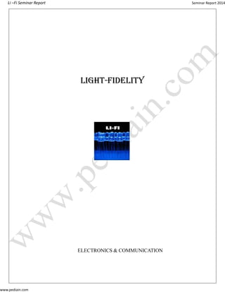 The document presents a seminar report on Light Fidelity (Li-Fi) technology, which allows data transmission through LED light bulbs by modulating their intensity faster than the human eye can perceive. Developed by Dr. Harald Haas, Li-Fi promises faster internet speeds than traditional Wi-Fi, overcoming bandwidth limitations by utilizing visible light communication (VLC). The report outlines the system design, methods of communication, future prospects, and potential applications of Li-Fi technology.