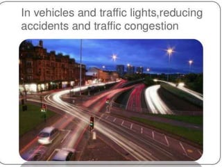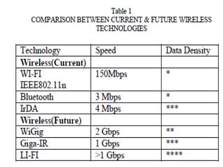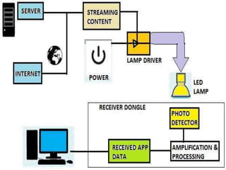The document discusses Li-Fi, a technology that transmits data through light using LEDs, offering high-speed, bidirectional communication. It highlights advantages like solving radio frequency congestion and providing secure transmission, while also addressing challenges such as light obstruction and high installation costs. Applications of Li-Fi include traffic lights, safe environments, and public internet hotspots, suggesting a future where every light source could serve as a data transmission hub.