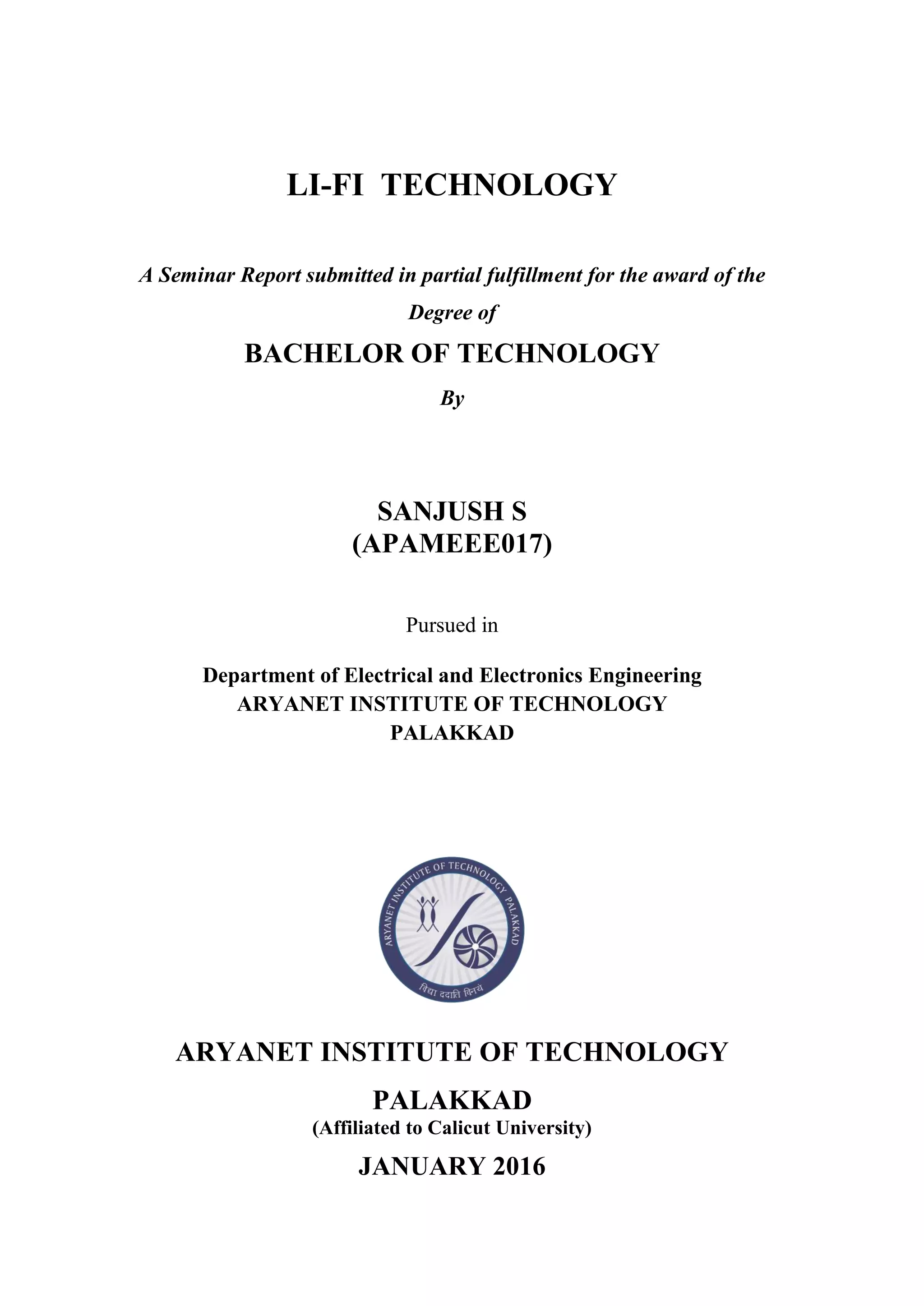 This document is a seminar report on Li-Fi technology submitted by Sanjush S. in partial fulfillment of a Bachelor of Technology degree. It provides an abstract, table of contents, and covers topics such as the history of Li-Fi, how Li-Fi works using visible light communication, Li-Fi technology components including transmitters and receivers, modulation techniques, standards, applications, and comparisons with Wi-Fi technology. The report was certified and acknowledged by faculty members at Aryanet Institute of Technology in Palakkad, India.