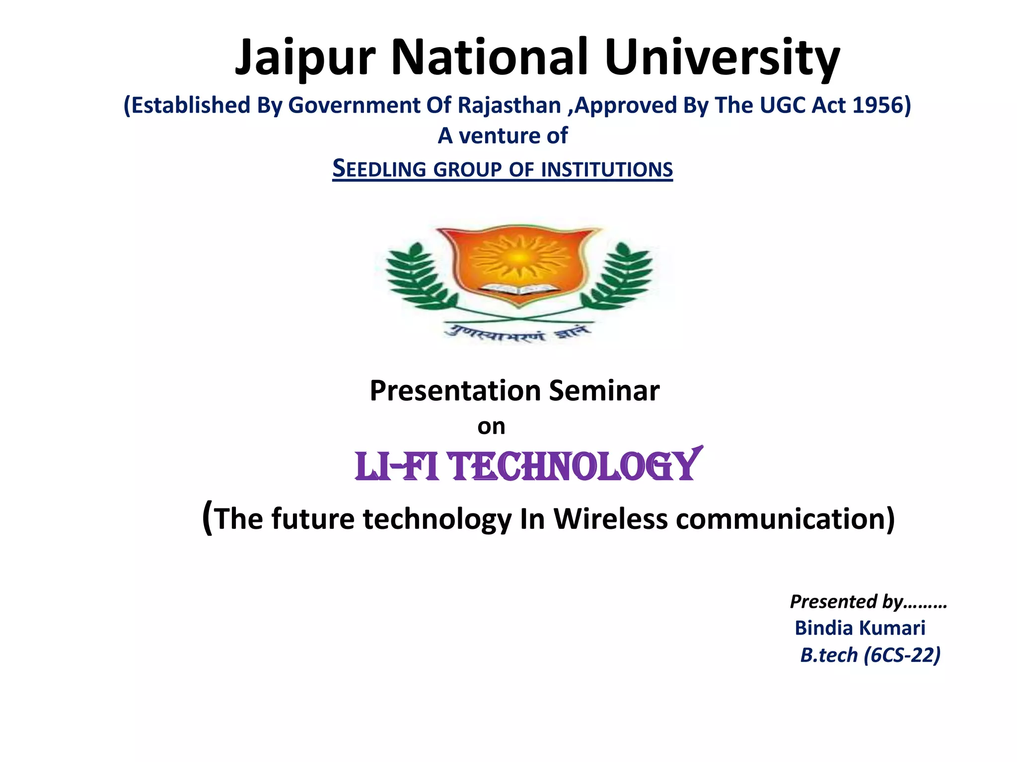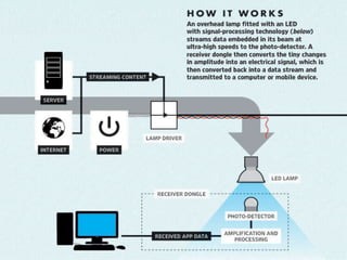 This document is a presentation on Li-Fi technology, which uses visible light communication to transmit data wirelessly. It introduces Li-Fi and how it works using LED lights to transmit data through rapid on-off pulses too fast for the human eye to detect. Key benefits are its ability to transmit data at very high speeds, its efficiency using existing light infrastructure, and its ability to transmit in places where radio waves cannot due to interference. Examples of potential uses include in hospitals, vehicles, power plants and underwater.
