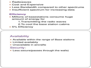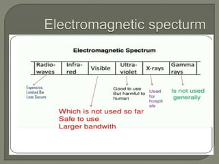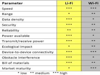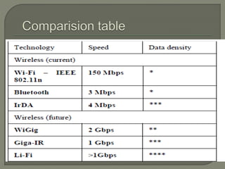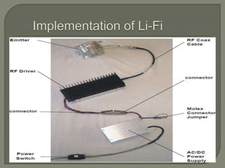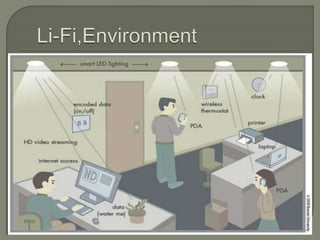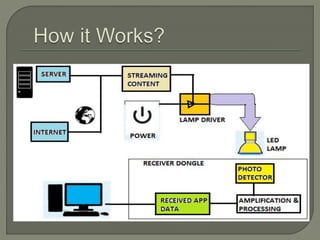 Li-Fi is a wireless communication technology that uses light from LED bulbs to transmit data. It works by switching the state of LED bulbs on and off very fast, in a way imperceptible to the human eye. A photodetector converts the flashes of light into electrical signals to decode the transmitted data. Li-Fi could provide higher speeds than Wi-Fi and has applications in areas where radio frequencies are regulated or restricted. However, it requires line of sight between the light source and detector and may not be suitable to replace Wi-Fi for all use cases.