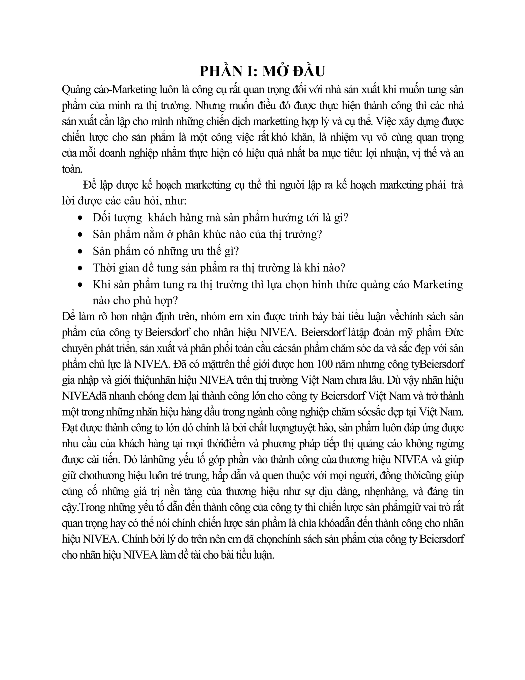 Tài liệu trình bày về tầm quan trọng của quảng cáo và marketing trong việc tung sản phẩm ra thị trường, điển hình là thương hiệu Nivea của tập đoàn Beiersdorf. Chiến lược sản phẩm, bao gồm các cấp độ từ sản phẩm theo ý tưởng cho đến bao gói và dịch vụ khách hàng, được nhấn mạnh như là yếu tố quyết định thành công. Nivea đã nhanh chóng thành công tại Việt Nam nhờ vào chất lượng sản phẩm và phương pháp tiếp thị hiệu quả.