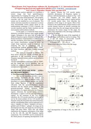 This document summarizes a research paper that proposes a new texture analysis and classification method based on wavelet transforms and linear regression models. The method analyzes the correlation between different frequency regions obtained from a 2D wavelet packet transform of sample texture images. A linear regression model is used to extract texture features characterizing this correlation. The method is compared to other multiresolution techniques like tree-structured wavelet transforms and Gabor transforms. Experimental results on a dataset of 40 textures show the new method significantly improves texture classification rates compared to existing approaches.