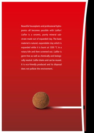 Liaflor is an expanded clay granulate substrate that is ideal for hydroponics, houseplants, and balcony/patio plants. It is made from natural clay that is expanded at high temperatures, resulting in a lightweight, porous material that drains well and stores water and nutrients. Liaflor promotes plant growth by providing good aeration and drainage while retaining moisture. It is chemically inert and reusable, making it an eco-friendly substrate. Liaflor is available in different particle sizes and can be used on its own or mixed with soil.