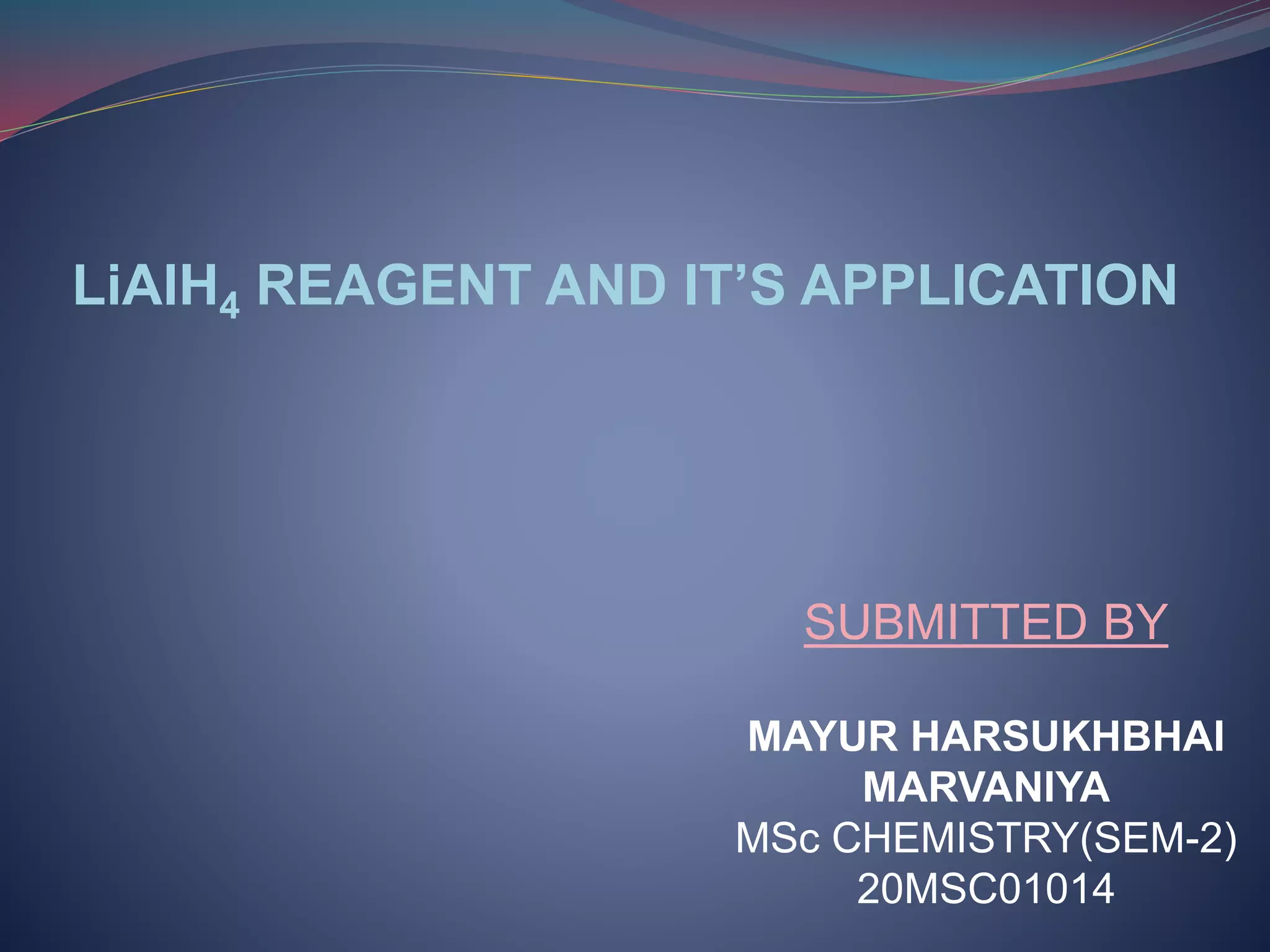 LiAlH4 is a strong reducing agent that is available as a powder or pellets and used in ether or THF solvent. It reduces compounds that are nonreactive to milder reducing agents like NaBH4 due to the weaker Al-H bonds. The document discusses the reduction mechanisms of LiAlH4 for carboxylic acids, amides, epoxides, and other functional groups.