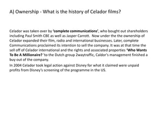 Celador was originally taken over by Complete Communications but was later bought back by its management. It produces films on a small scale by contracting freelance staff and obtaining funding through various means like bank loans or co-productions. Celador has produced seven films since 1999 across different genres. It also operates two radio stations. While a small company, Celador has found market success through ticket and DVD sales of its films. However, it faces competition from much larger studios like Sony Pictures Entertainment who have significantly higher film budgets.