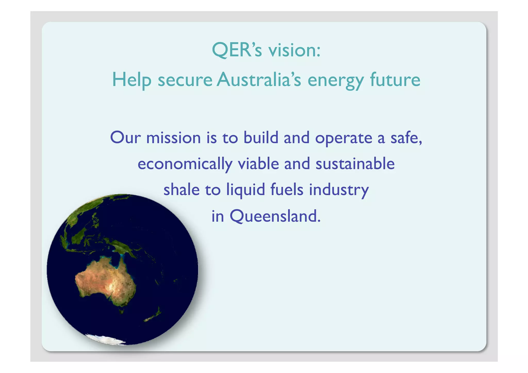 The document discusses QER's vision to help secure Australia's energy future through the sustainable development of a shale to liquid fuels industry in Queensland. It outlines QER's plans to build a demonstration plant and later commercial plants to produce fuels like diesel and jet fuel from shale in a way that reduces emissions and creates jobs, while engaging with communities to obtain a social license to operate. The shale to liquids industry is positioned as having the potential to significantly reduce Australia's fuel imports and trade deficit by 2030.