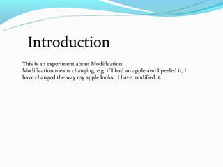 The document describes an experiment to chemically change sugar into carbon. The experiment involves heating sugar in a pot until it melts into a liquid, hardens into a toffee-like substance, and then turns solid and black as it transforms into carbon. The process shows how applying heat can drive a chemical reaction that modifies something sweet and edible into an inorganic solid through changes in its physical state and color.