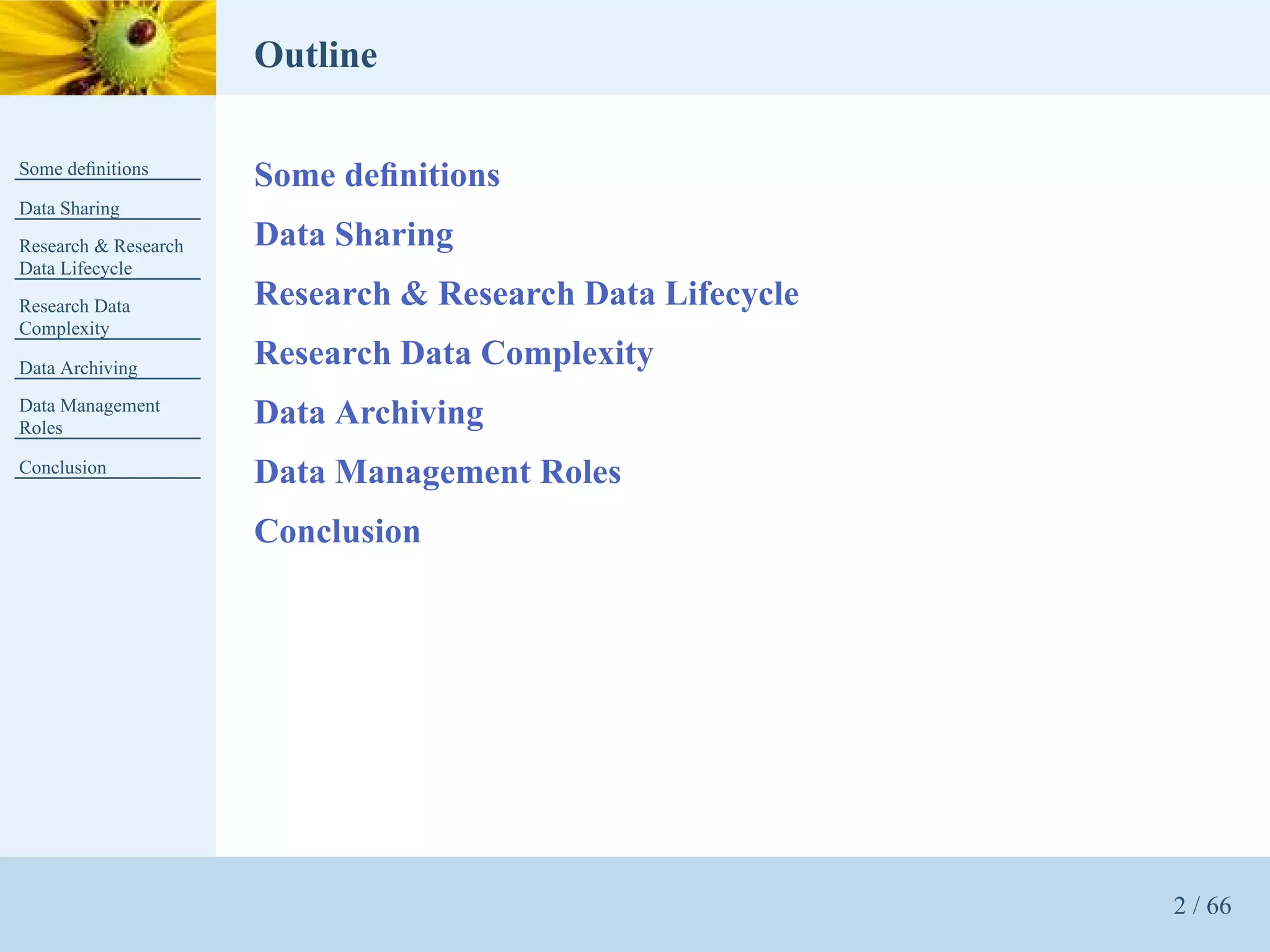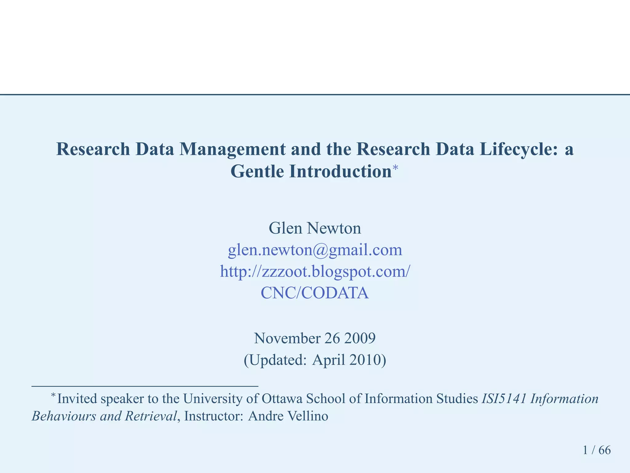 This document provides a gentle introduction to research data management and the research data lifecycle. It defines key terms like research, research data, and research data lifecycles. It discusses the benefits of data sharing, including enabling new research and testing new hypotheses. Research data can be complex with data, metadata, transformations, and combinations. The document outlines the research data lifecycle from collection to archiving and roles in data management.