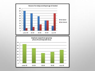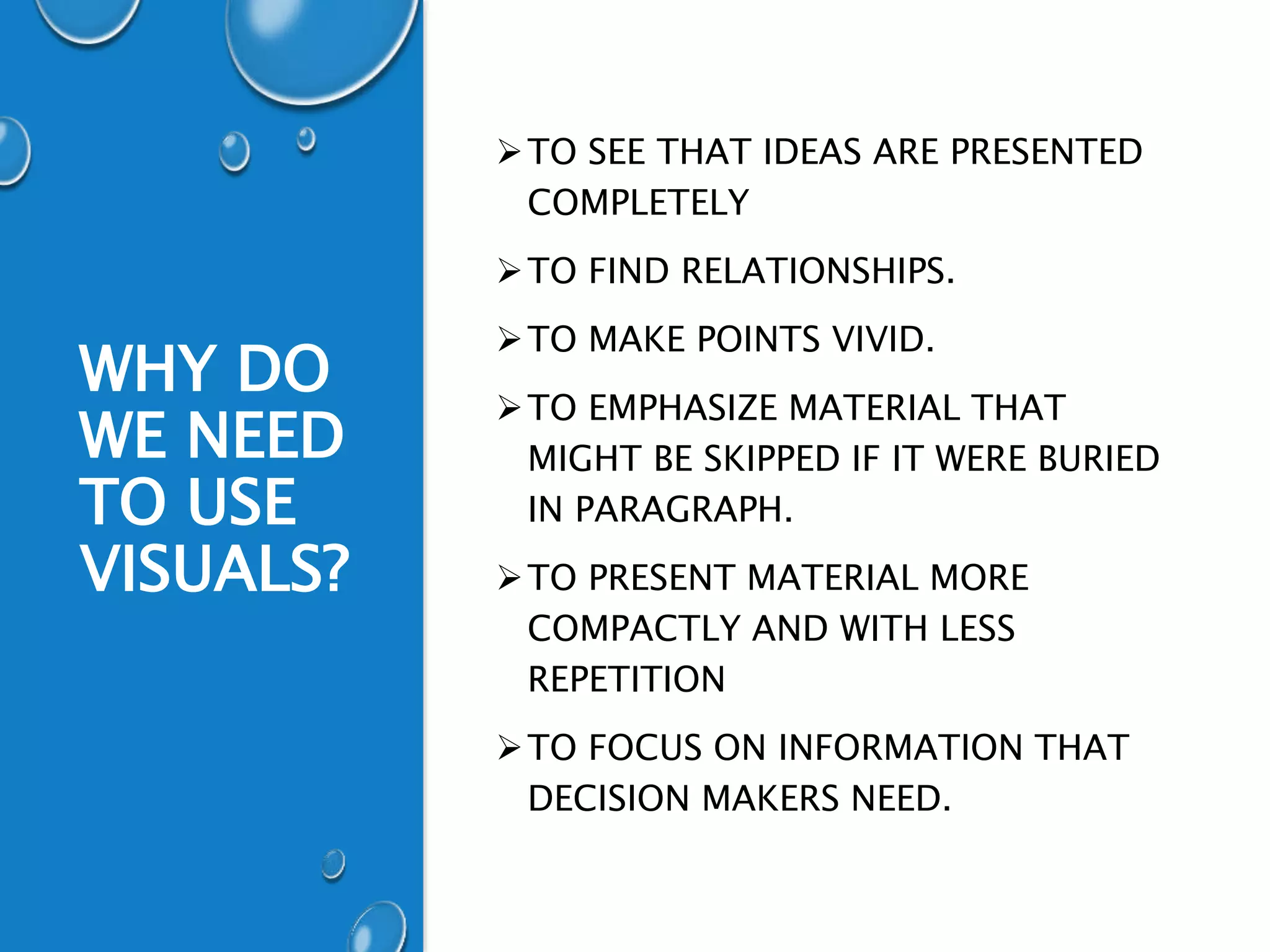The document discusses using visuals to present information and stories in data. It explains that visuals help make ideas more complete, find relationships, make points vivid, emphasize key material, and present information compactly. Different types of visuals like tables, charts, graphs and flowcharts are best suited for certain types of stories and relationships. Design conventions like clear titles, labels, legends and sources should be followed. The best visual depends on whether the reader needs exact values or to see relationships and changes. Matching the right visual to the story is important for effective communication.