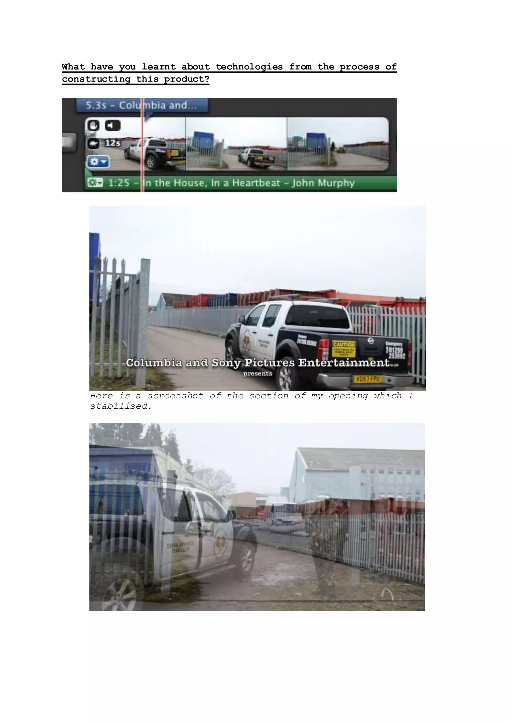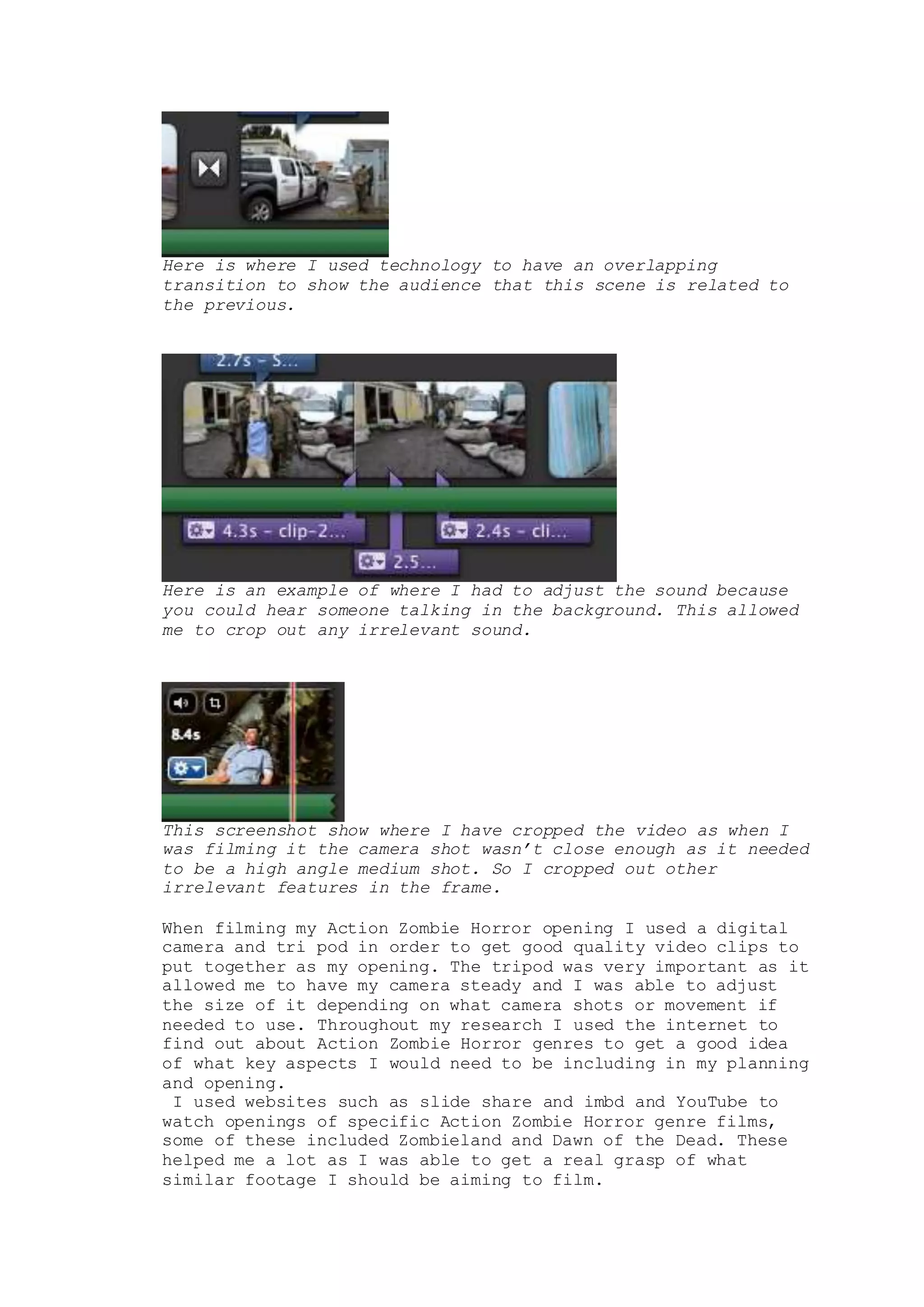The document discusses the technologies used to create an action zombie horror film opening. It describes using a digital camera and tripod for filming, and researching the genre online to understand conventions. iMovie was used to edit clips, add transitions, adjust sound and color, and create titles. Skills like organizing footage and explaining directorial visions to actors were developed. The summarizer learned to use iMovie more effectively for editing, applying more technical changes between the preliminary and final projects.