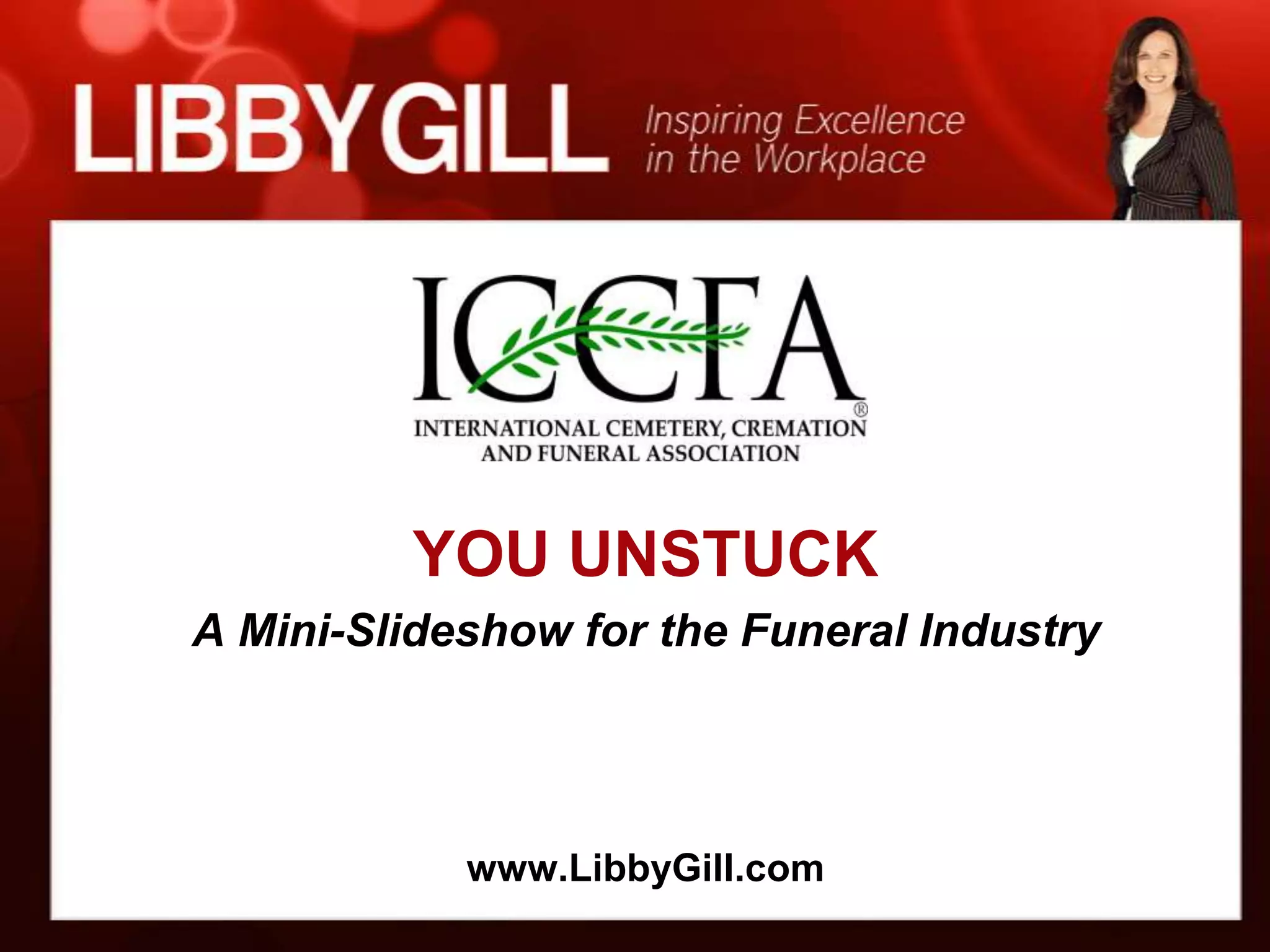The document provides a mini-slideshow for the funeral industry with tips to help get unstuck. It outlines 4 key steps: 1) Follow the "CSE" model to clarify the vision, simplify the path, and execute the plan. 2) Maximize leadership DNA by understanding leadership styles. 3) Define a personal brand by focusing on passions, strengths, and emotional connections. 4) Live the Kaizen concept by creating incremental change and making bold actions. The overall message is to not underestimate one's power to shape memories and make bold moves.