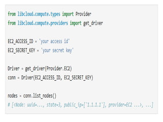 Libcloud and JClouds provide open source libraries that offer abstract APIs for interacting with multiple cloud platforms. Libcloud supports Python while JClouds supports Java. They aim to solve the problems of managing multiple cloud stacks that have different APIs by providing a common interface. This helps avoid vendor lock-in and allows applications to easily work across different cloud providers like AWS, Rackspace, Cloud.com and others.