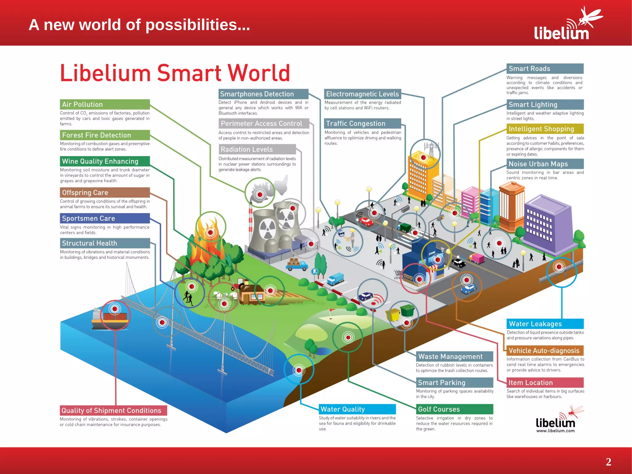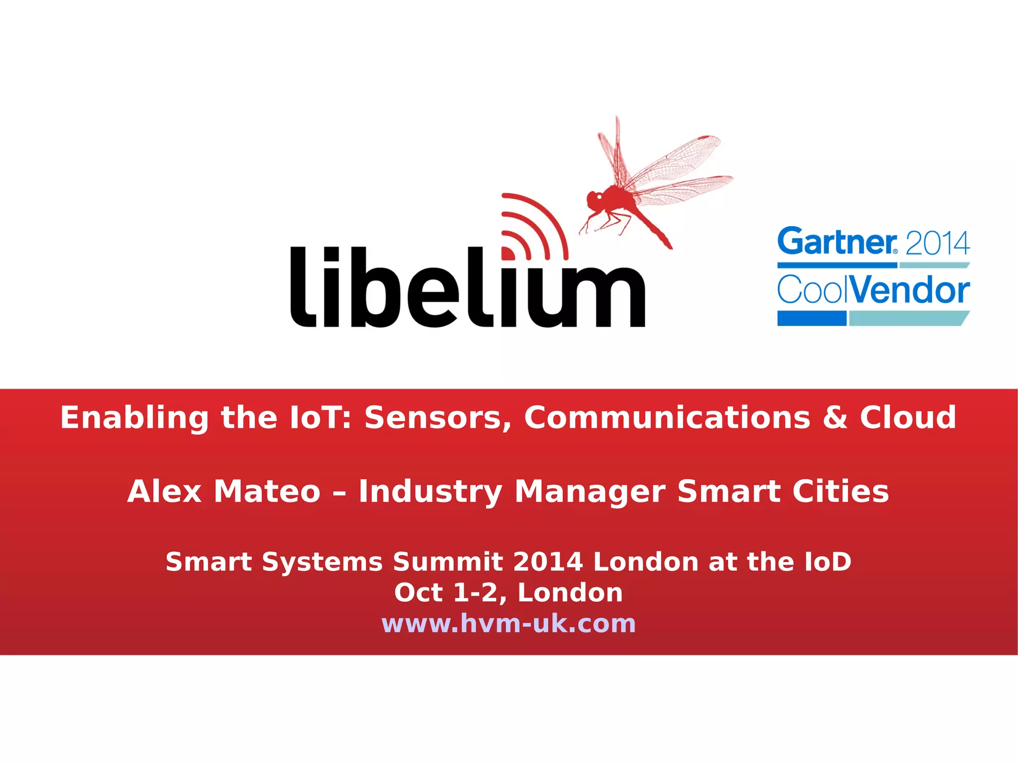 The document discusses enabling the Internet of Things through sensors, communications, and cloud infrastructure. It highlights Libelium as a company providing standardized IoT platforms, and gives examples of their technology being used in smart city projects in Santander, Spain and Serbia to implement solutions like smart parking, environmental monitoring, and smart lighting through wireless sensor networks.