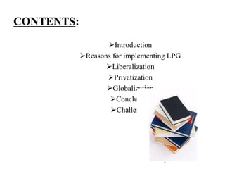 1) In 1991, India implemented economic reforms known as Liberalization, Privatization, and Globalization (LPG) due to factors like a balance of payments crisis, high government debt, and inefficiency.
