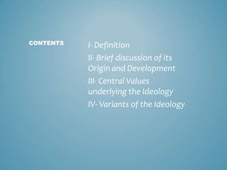Liberalism is an ideology that emphasizes individualism, freedom, reason, justice, and toleration. It originated as a response to feudalism and the rise of the middle class. There are several variants of liberalism including classical liberalism, economic liberalism, neoliberalism, and modern liberalism. Modern liberalism supports a more interventionist state than classical liberalism to address social injustices.