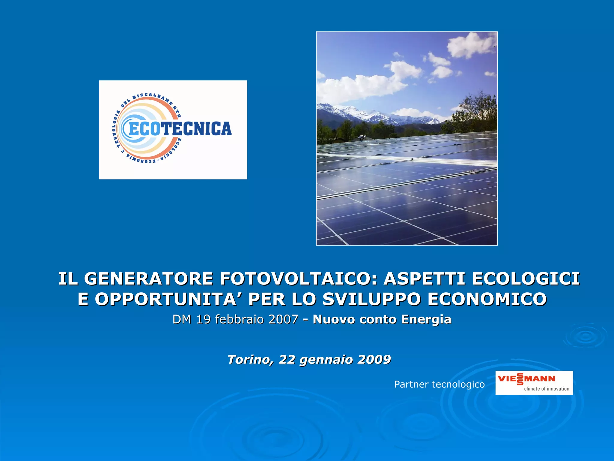 Il documento tratta del 'nuovo conto energia' in Italia, evidenziando le opportunità economiche e ambientali derivanti dall'uso di impianti fotovoltaici e geotermici per la produzione di energia da fonti rinnovabili. Viene descritta l'integrazione fra vari sistemi energetici, che consente di azzerare i costi di gestione e ridurre le emissioni nocive. Inoltre, il documento sottolinea la necessità di migliorare l'informazione al pubblico e affronta le problematiche di marketing e burocrazia nel settore delle energie rinnovabili.