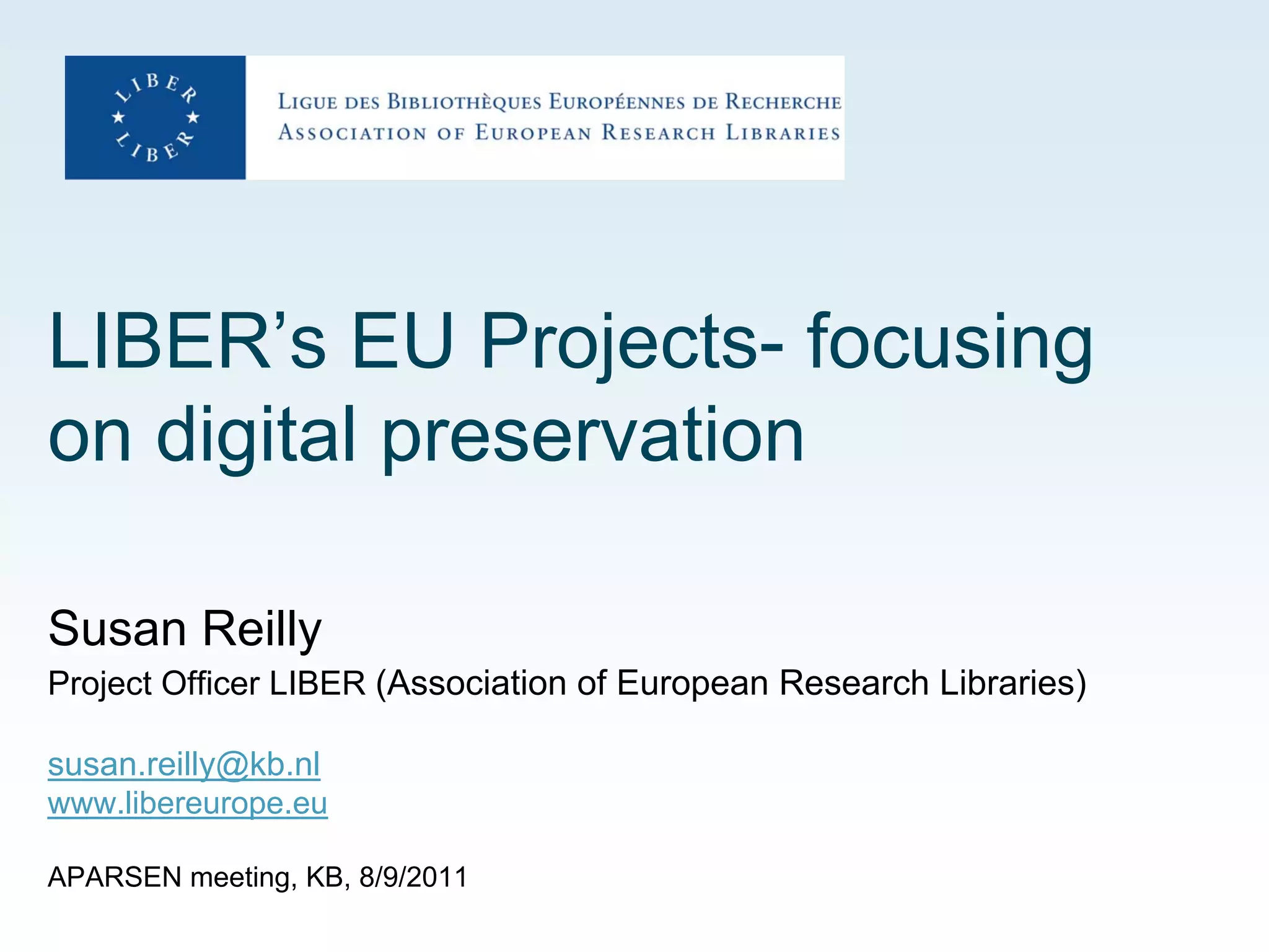 LIBER is a network of European research libraries that aims to promote efficient information services and access to research. It is involved in several current EU projects related to digital preservation, including Europeana Libraries, APARSEN, and ODE. As part of APARSEN, LIBER contributes to developing a common vision, business cases, stakeholder communication, and training. ODE seeks to identify best practices and barriers around data sharing, reuse, and preservation. LIBER recognizes the importance of digital preservation and collaborating with other organizations through EU projects to achieve its mission related to e-science, research infrastructures, and open access to data.