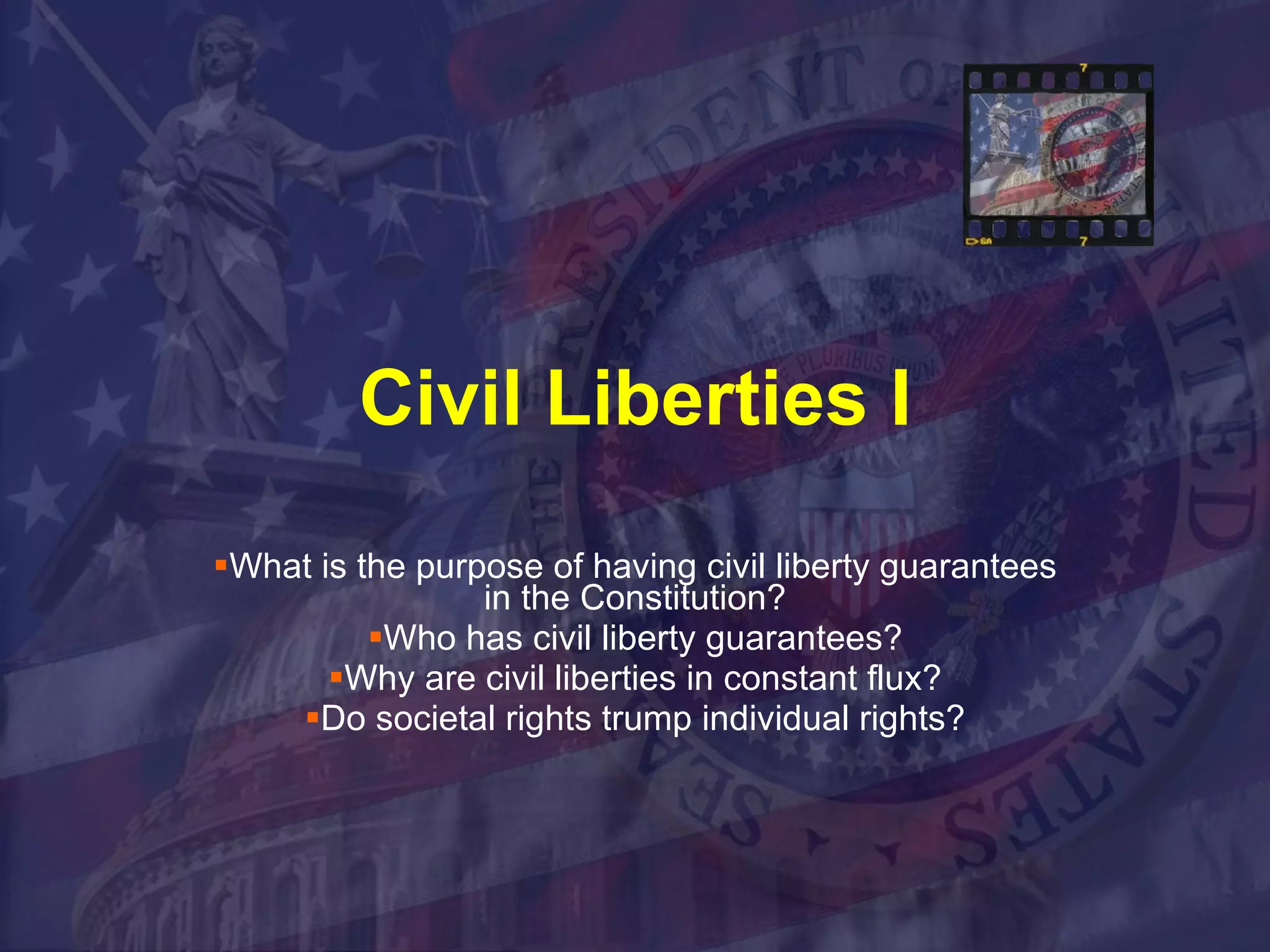 The document discusses civil liberties in the United States Constitution. It provides context on the Bill of Rights and how it protects individual freedoms such as freedom of speech, press, religion, and protections from unlawful search and seizure. It also discusses ongoing debates around balancing individual rights with societal interests and national security, including discussions on the USA PATRIOT Act and presidential powers in times of war or crisis.