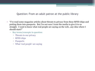 The patron asked about threats to privacy from RFID chips in passports and what real people are saying online. The librarian performed a search on Kartoo, a metasearch engine, restricting results to blogs and forums. The top 10 results included discussions on disabling RFID chips, security risks, petitions to remove chips, consumer advocacy information, and reactions to news articles on e-passports. While the sources were older, they provided a variety of perspectives from the public to adequately address the patron's question.