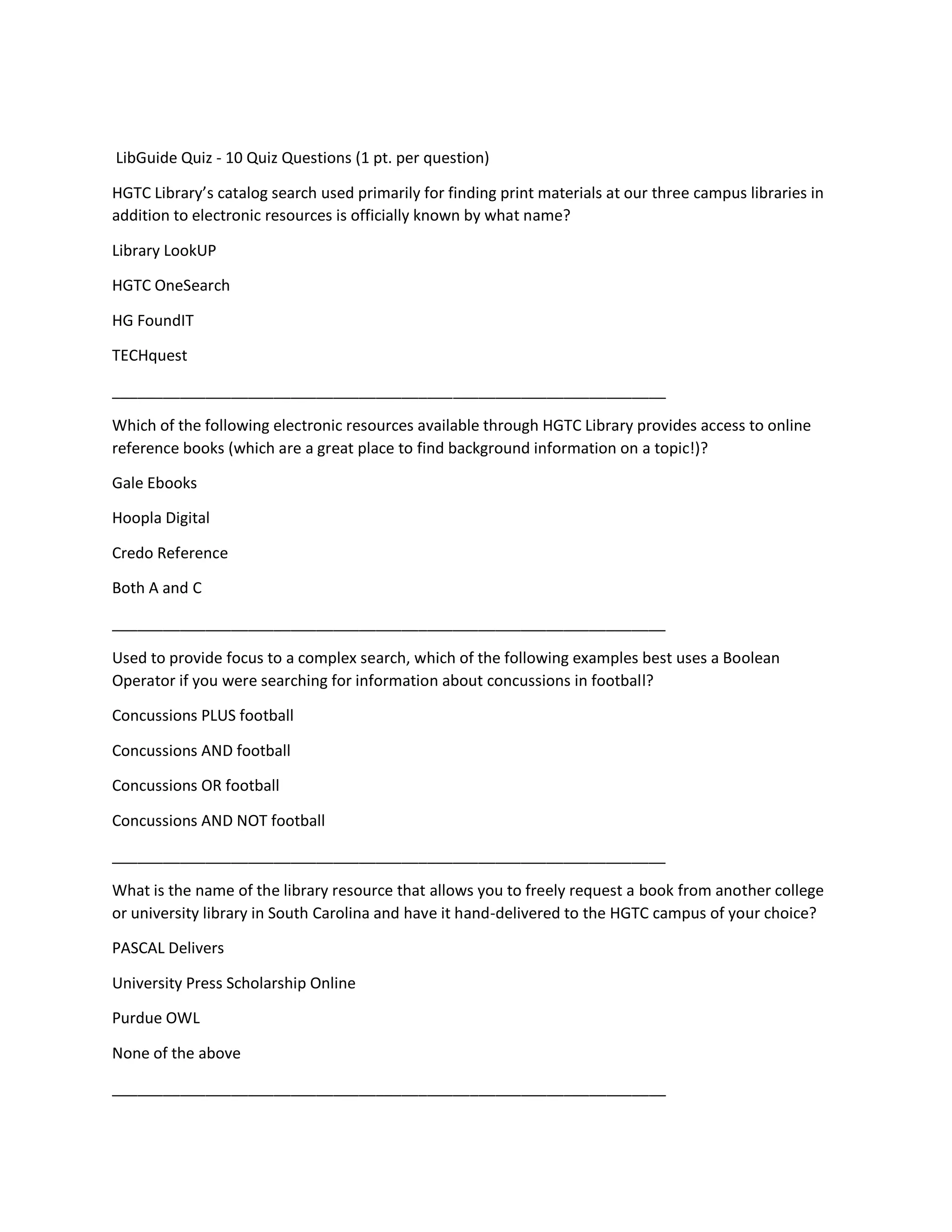 The document is a 10 question quiz about resources available through HGTC Library. It asks multiple choice questions about the library catalog search tool, electronic resources like databases that provide ebooks and reference books, using Boolean operators in complex searches, interlibrary loan services, streaming video platforms with mobile apps, items unlikely to be found in databases, the online citation generator subscribed to by the library, off-campus access requirements, and methods for contacting the library for assistance.