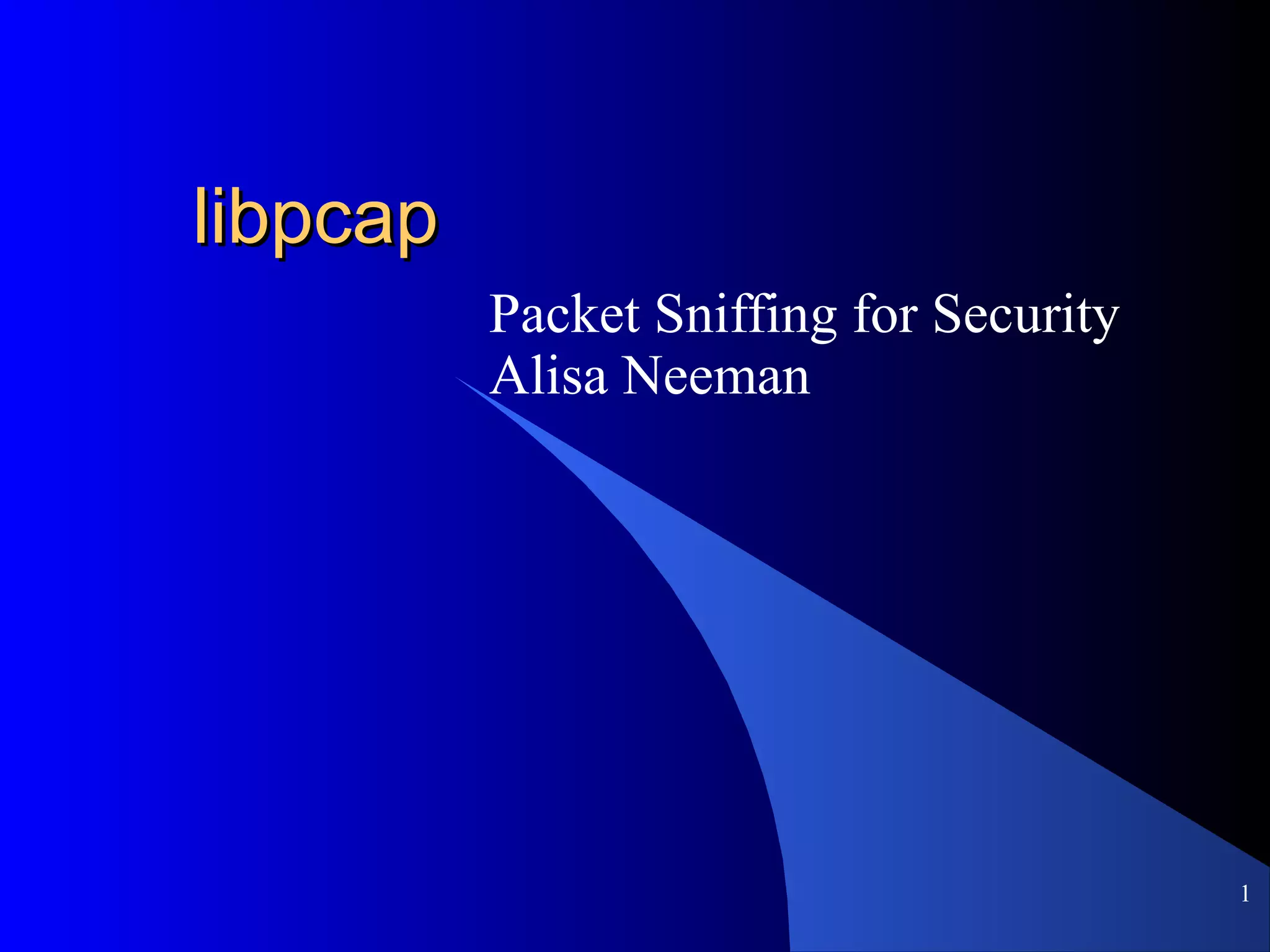 This document provides an overview of using the libpcap library to perform packet sniffing in C. It discusses installing libpcap on Linux and Windows, avoiding common C programming gotchas, the basic structure of a libpcap program including opening a live network interface and implementing a packet processing callback loop. It also covers reading the Ethernet, IP, and TCP/UDP headers of packets and using BPF filters to filter packets.