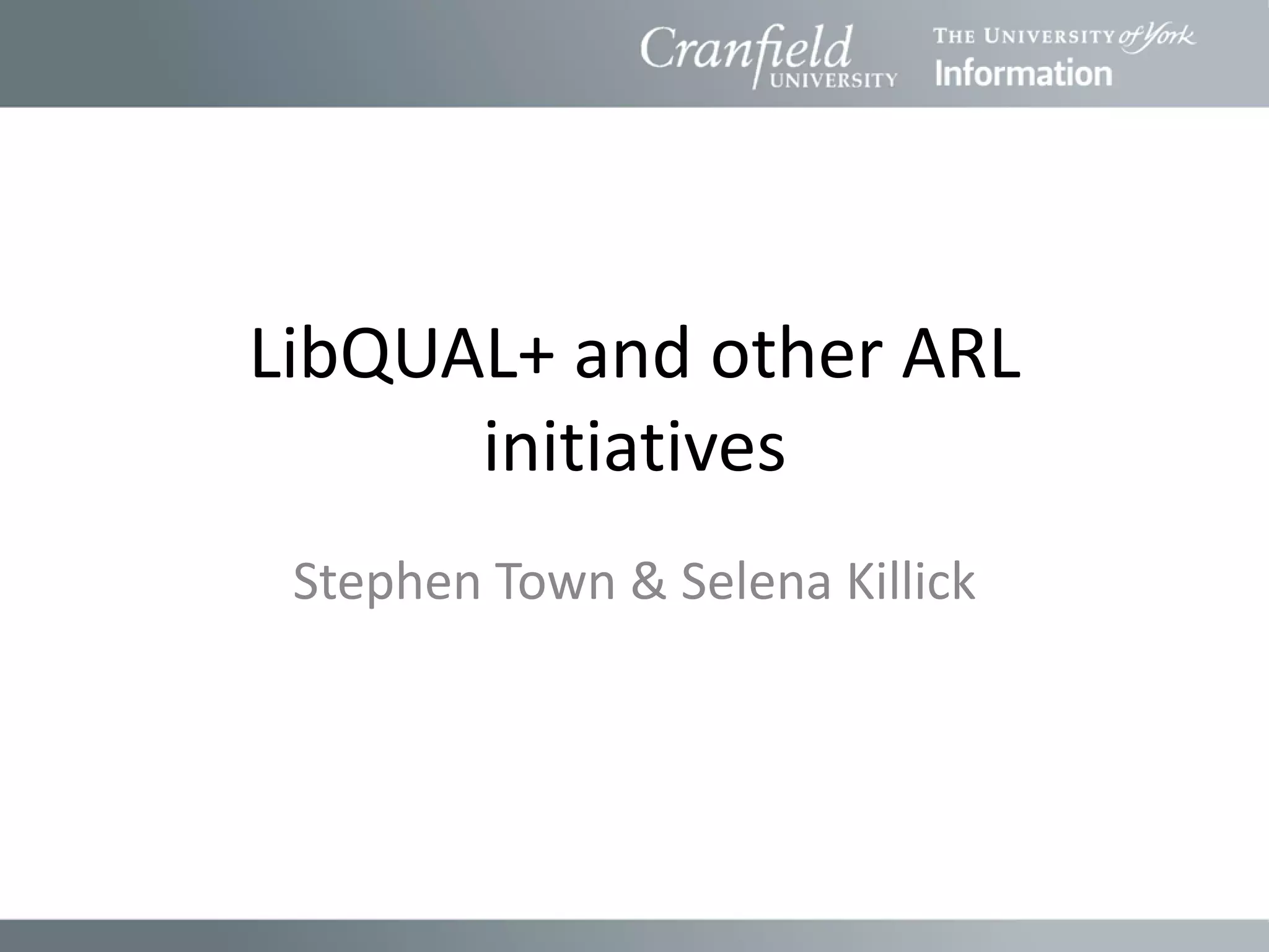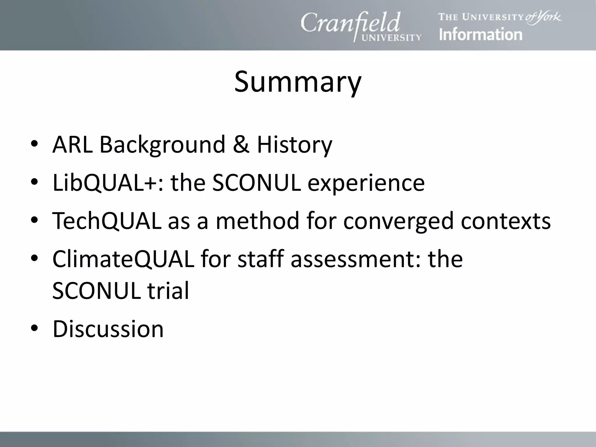 This document summarizes several initiatives by the Association of Research Libraries (ARL) related to assessing library services. It discusses LibQUAL+, a survey tool used to measure user perceptions of service quality, and how it has been implemented in the UK through SCONUL. It also introduces TechQUAL and ClimateQUAL as additional assessment tools for IT services and organizational culture, respectively, and provides examples of results from trials of these tools in UK universities.