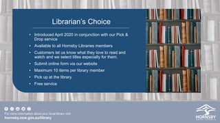 The document discusses the Librarian's Choice service offered by Hornsby Shire Library Service. The service allows library members to submit an online form with information about their interests and preferences, and librarians will select up to 10 titles especially for them. Librarian's Choice was introduced in April 2020 and builds on the library's existing reader advisory services, using all available collections to hand pick 1900 items for 217 initial customers.