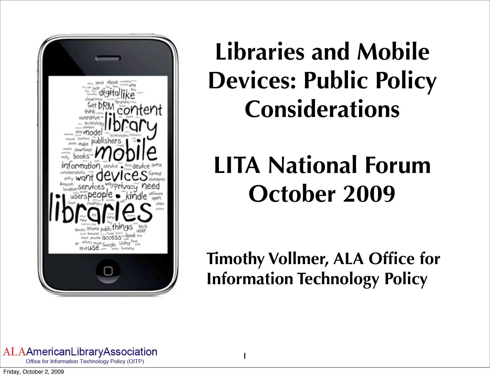 The document discusses public policy considerations related to libraries and mobile devices. It covers issues like digital copyright and licensing, digital rights management, privacy, and accessibility in the mobile environment. It also provides updates on the work of ALA's Office for Information Technology Policy and Office of Government Relations regarding relevant policies. The presentation encourages libraries to embrace innovation while upholding their values of empowering users and engaging with technology and policy discussions.