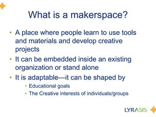 This document discusses the concept of libraries as makerspaces. It defines makerspaces as places where people can learn tools and materials to develop creative projects through sharing skills and collaborating. Makerspaces are born out of community collaboration and creativity rather than specific equipment. The document outlines several examples of successful makerspace models in libraries, including collaborative models with non-profits, centralized on-site makerspaces, and opportunistic redesign of existing library spaces. It emphasizes that makerspaces should engage a diversity of community members and interests through partnerships, funding, and resources.